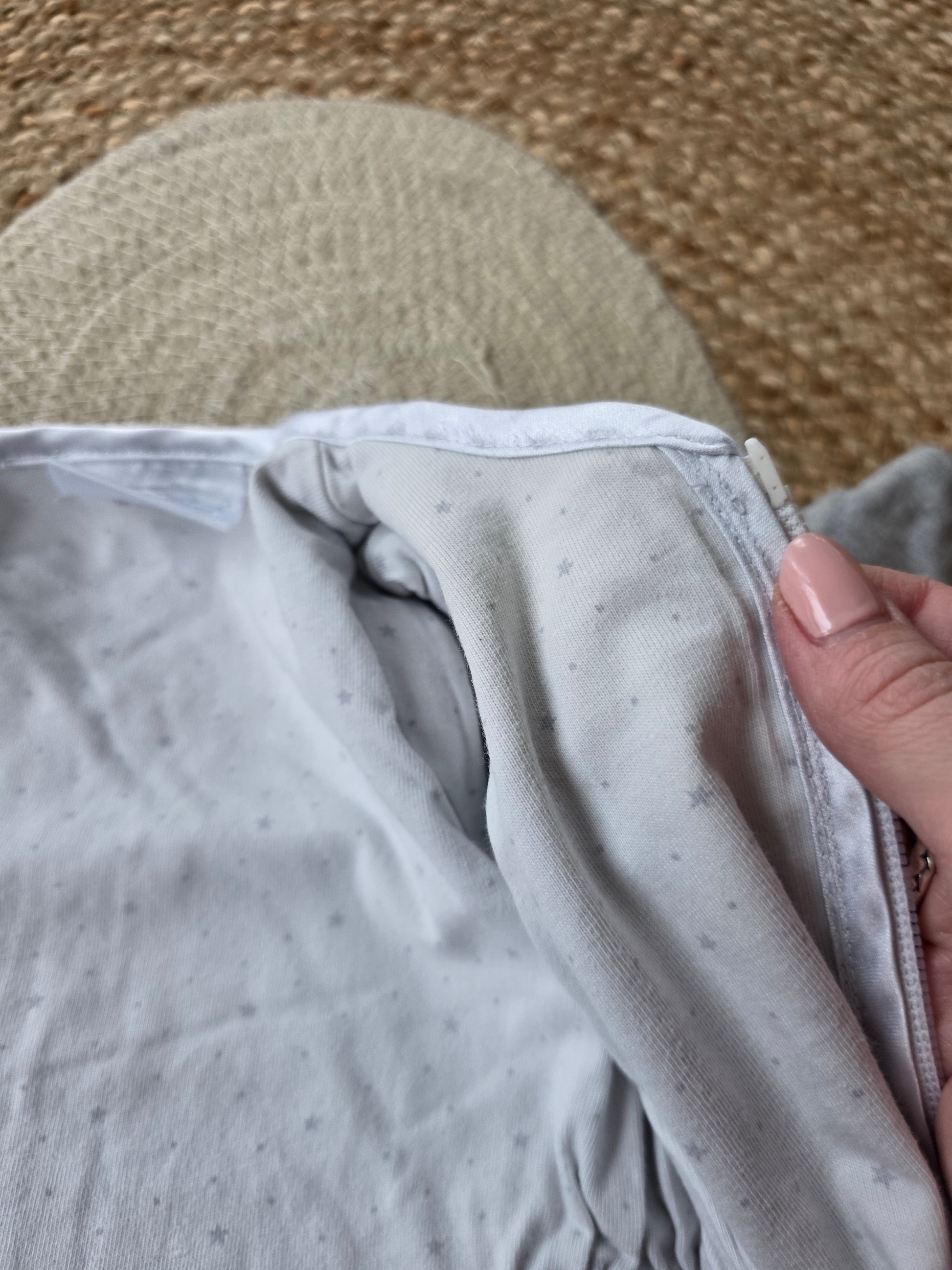 Pluizig en de binnenkant is iets verkleurd. Verder prima. Voor 0-6 maanden en 0.5 tog waarde.
