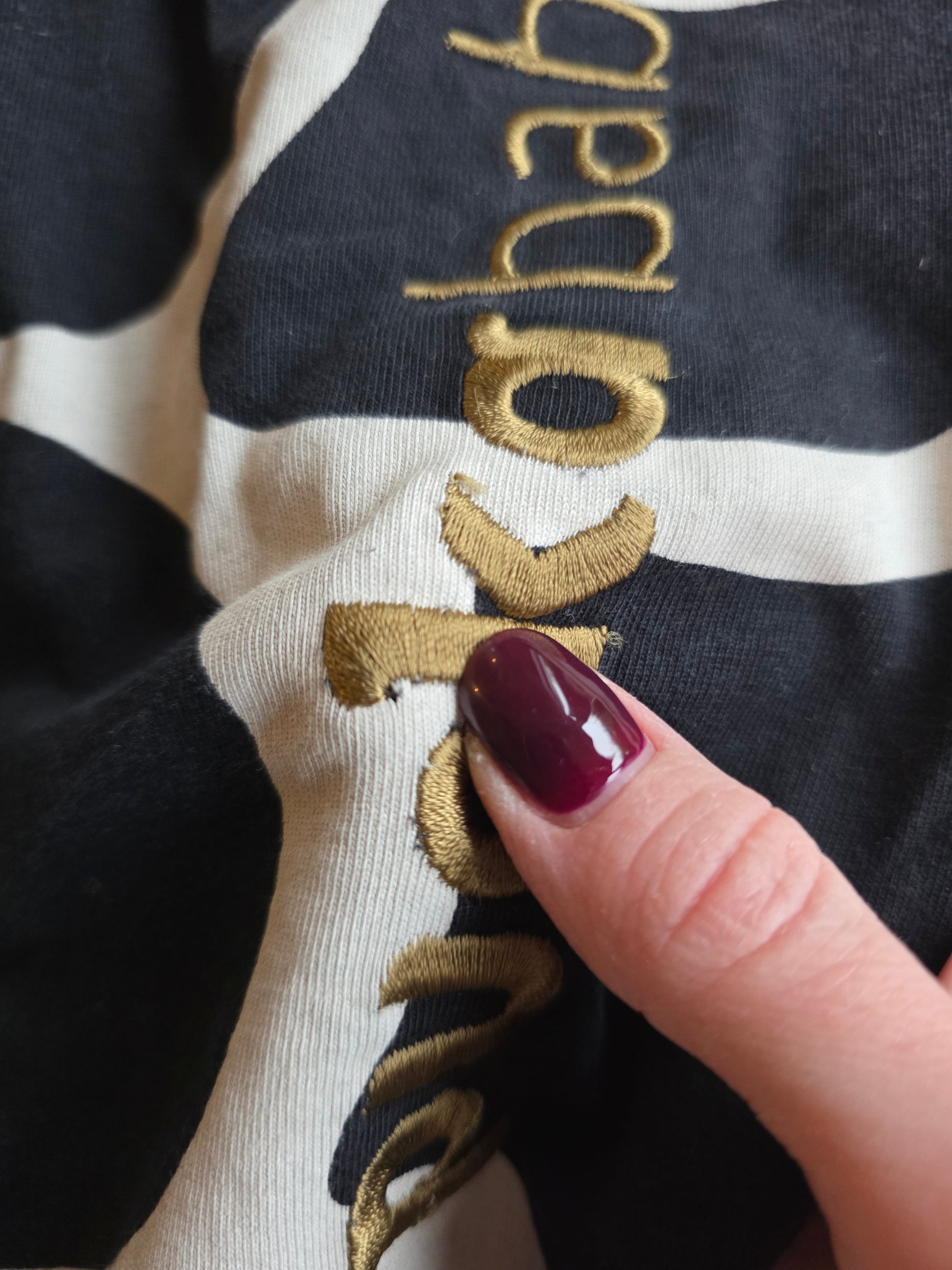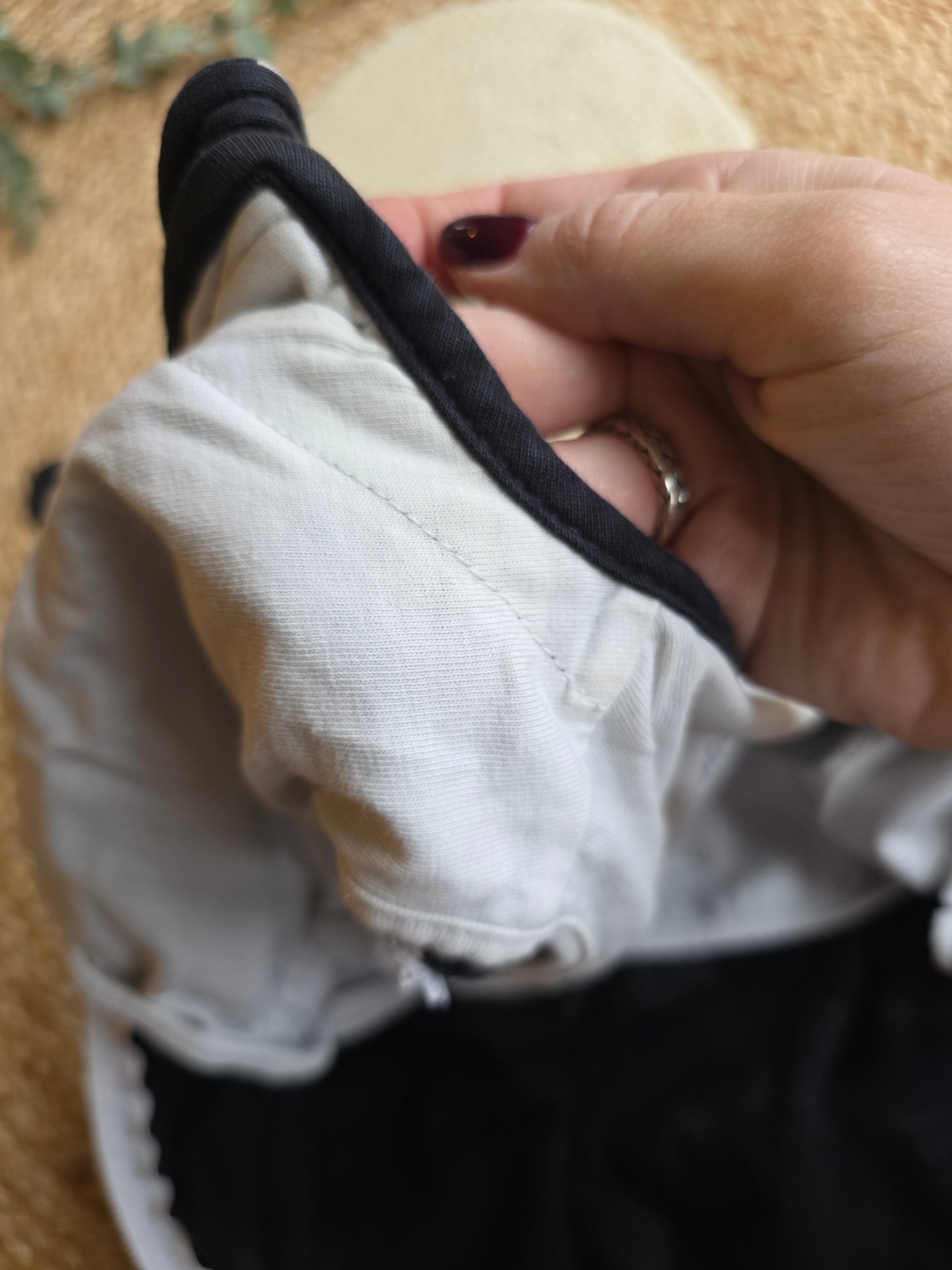Heeft 2 gaatjes. Binnenin iets verkleurd en klittenband is grauw. Verder prima.