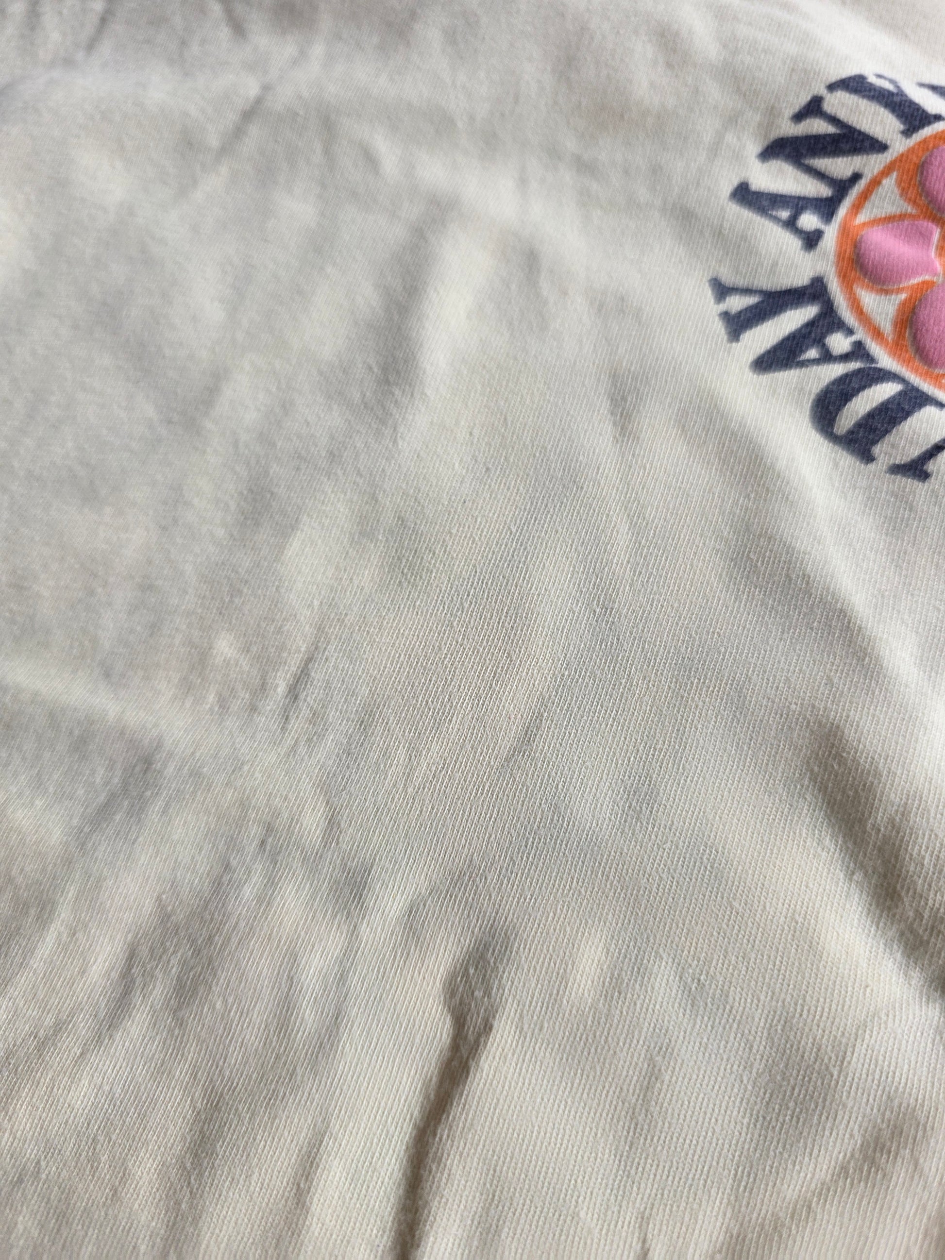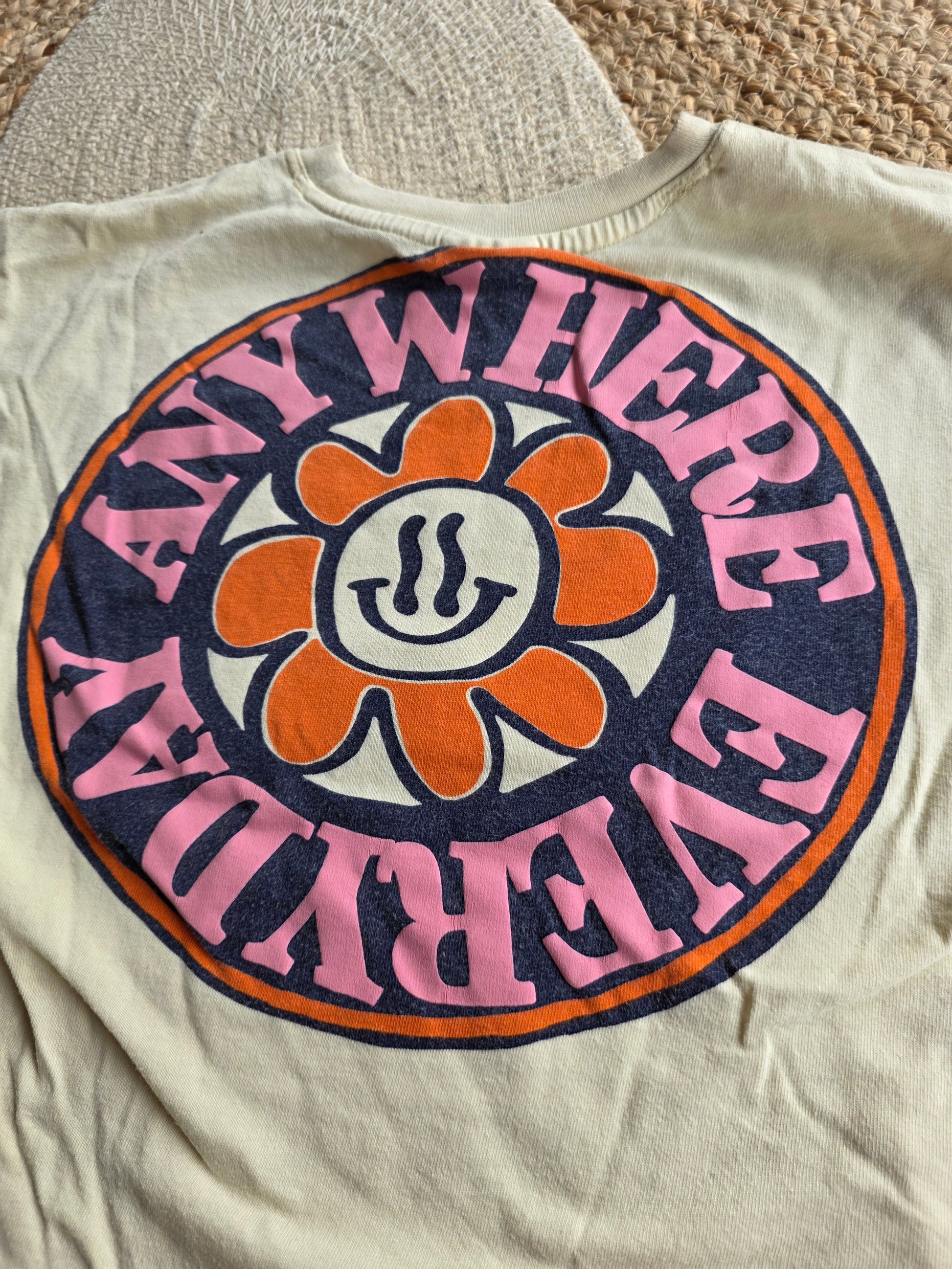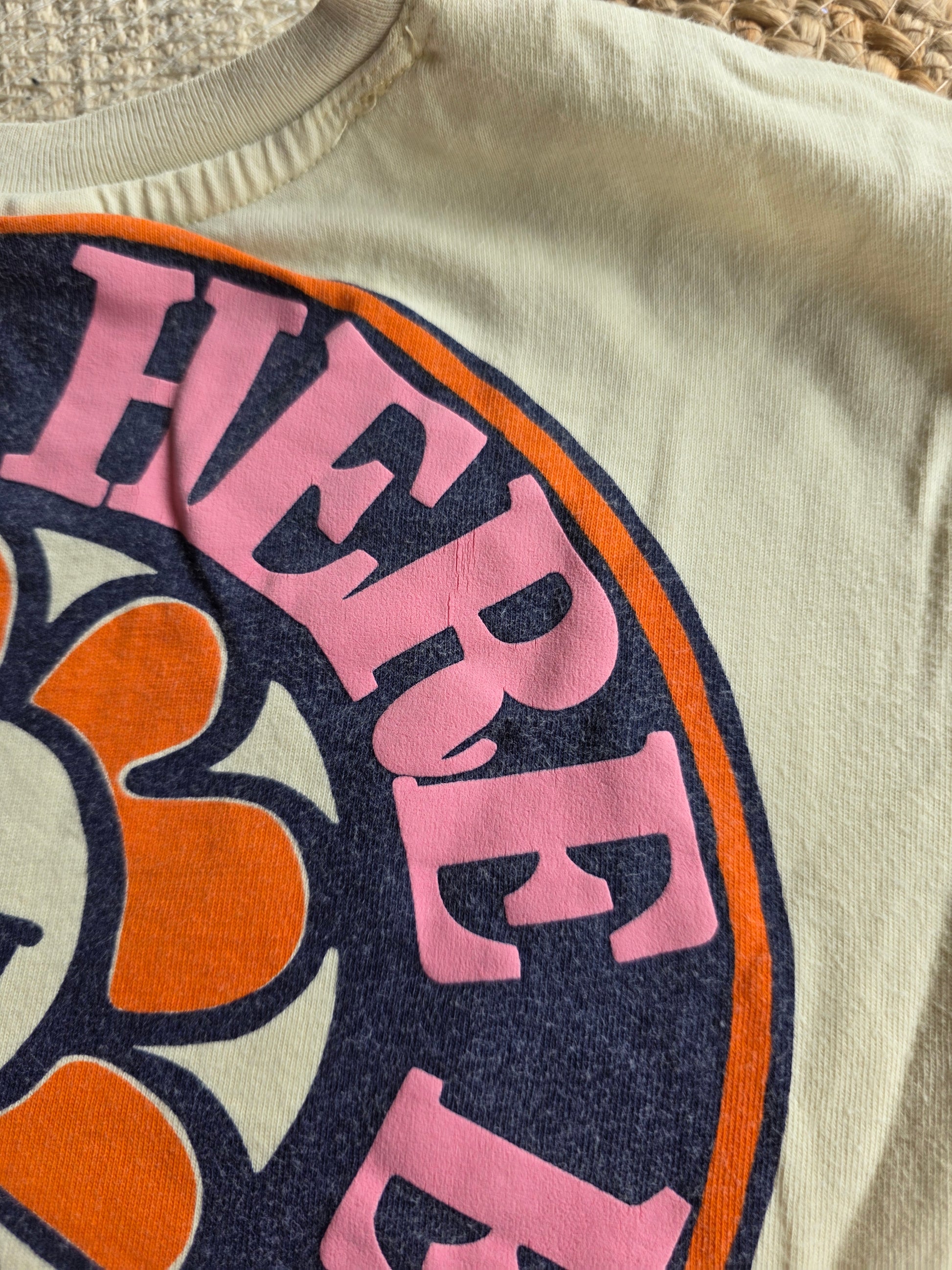 Pluizig en print achterop iets gescheurd. Verder netjes.